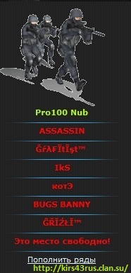 Состав клана для ucoz css <IMG src="http://altcore.clan.su/_si/0/02913.gif"> <div align="center"> <im<b><font color=#b4ff00>Pro100 Nub</b></font><br> <IMG src="http://css-tecktonik.clan.su/ruska.png"> <div align="center"> <im<b><font color=red>ASSASSIN</b></font><br> <IMG src="http://css-tecktonik.clan.su/ruska.png"> <div align="center"> <im<b><font color=red>Ğŕλ₣ĨtĨşt™ </b></font><br> <IMG src="http://css-tecktonik.clan.su/ruska.png"> <div align="center"> <im<b><font color=red>IkS</b></font><br> <IMG src="http://css-tecktonik.clan.su/ruska.png"> <div align="center"> <im<b><font color=red>котЭ</b></font><br> <IMG src="http://css-tecktonik.clan.su/ruska.png"> <div align="center"> <im<b><font color=red>BUGS BANNY</b></font><br> <IMG src="http://css-tecktonik.clan.su/ruska.png"> <div align="center"> <im<b><font color=red>ĜŘĬŹŁĬ™</b></font><br> <IMG src="http://css-tecktonik.clan.su/ruska.png"> <div align="center"> <im<b><font color=red>Это место свободно!</b></font><br> <IMG src="http://css-tecktonik.clan.su/ruska.png"> <a href="Ссылка где оставить заявку в клан!">Пополнить ряды</a>