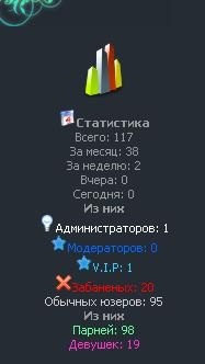 | Статистика пользователей для сайта ucoz css Создаем информер с такими настройками:Счетчики для пользователей · Материалы · всех, по группам, по полу, по зодиаку, по дням (сегодня, вчера, 7 дней, 30 дней) И заменяем стандартный скрипт на этот : <div align="center"> <p><img src="http://www.csinfofan.ru/desing/stats.gif" width="52" height="52"></p> <p><strong><img src="http://sweetnet.at.ua/images/20.png" width="16" height="16">Статистика</strong> <br> Всего: $ALL_USERS$ <br> За месяц: $30DAYS$ <br> За неделю: $7DAYS$ <br> Вчера: $YESTERDAY$ <br> Сегодня: $TODAY$ <br> <strong>Из них</strong> <br> <font color="#ff0000"><img src="http://src.ucoz.ru/img/icon/nw.png" width="16" height="16"><font color="#FFFFFF">Администраторов: $GROUP_4$</font></font> <br> <font color="#0000cd"><img src="http://all-for-cs.ru/222333333333333.PNG" width="16" height="16"><font color="#0066FF">Модераторов: $GROUP_3$</font></font> <br> <font color="#33CCFF"><img src="http://all-for-cs.ru/222333333333333.PNG" width="16" height="16">V.I.P: $GROUP_2$</font> <br> <font color="#FF0000"><img src="http://s21.ucoz.net/img/icon/del.png" width="16" height="16">Забаненых: $GROUP_5$</font> <br> <font color="#CCCCCC">Обычных юзеров: $GROUP_1$</font><br> <strong>Из них</strong> <br> <font color="#66FF99">Парней: $GENDER_1$</font><br> <font color="#FF33CC">Девушек: $GENDER_2$</font></p> </div>